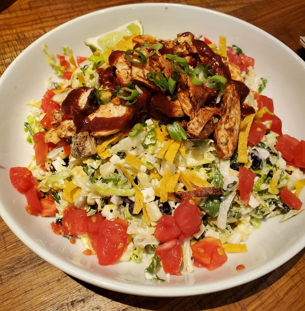 Instructions for California Pizza Kitchen Original BBQ Chicken Chopped Salad. Cover the chicken breasts with plastic wrap and use a kitchen mallet to pound them to about 12-inch thick. The Original BBQ Chicken Chopped has chopped lettuce black beans sweet corn jicama cilantro basil crispy corn tortilla strips and Monterey Jack cheese tossed together in an herb ranch dressing.